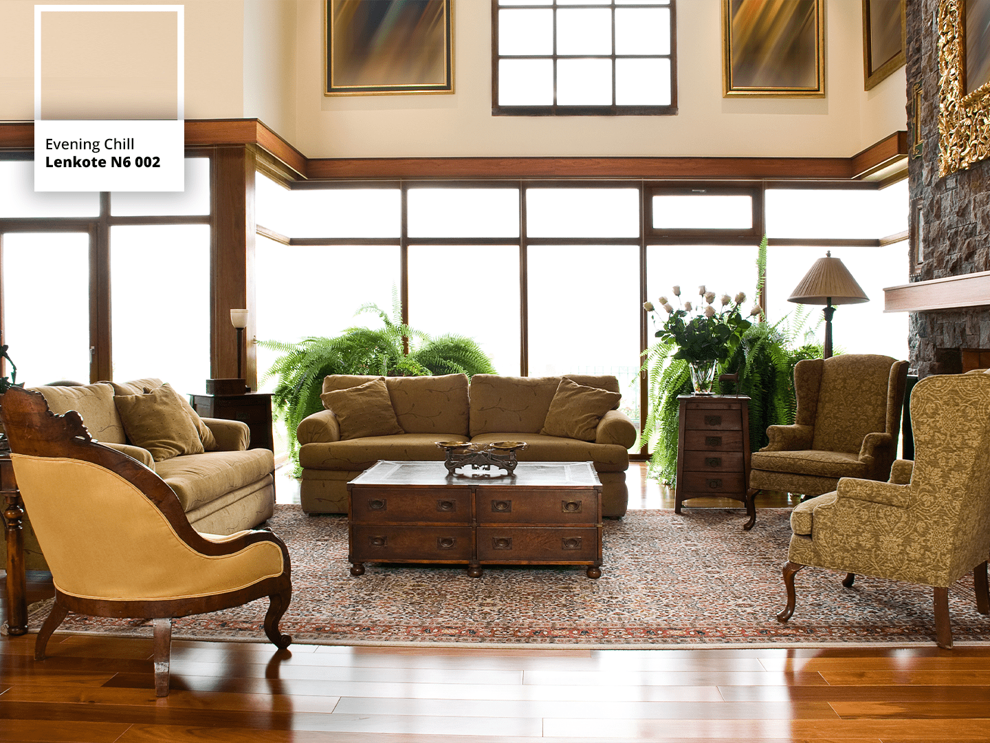 Umumnya ruang tamu dengan nuansa klasik vintage memadukan warna putih, hitam, coklat atau nuansa alami. Biasanya, kursi yang digunakan juga cenderung lebih besar dan terdapat sandaran tangan.
