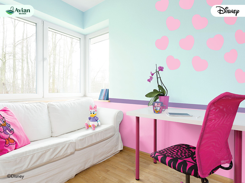 Sahabat Avian Brands bisa mengaplikasikan cat Avian Brands seri Disney, yaitu cat tembok Everglo Kids Care dengan tampilan kilap dan halus serta mudah dibersihkan juga mempunyai keunggulan anti bakteri yang mampu mencegah penyakit asma, flu, dan diare. Sangat ideal untuk digunakan pada kamar tidur anak.