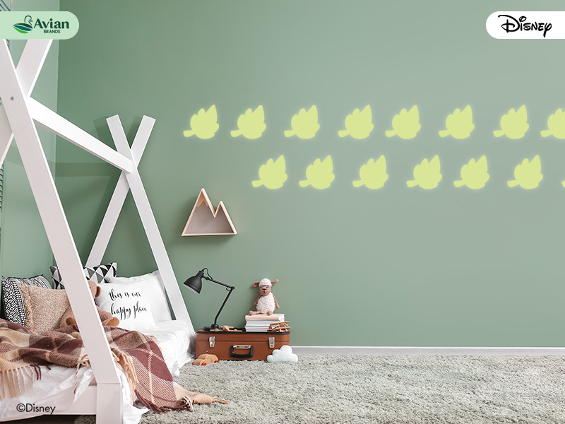 Agar terlihat lebih menarik lagi, Sahabat Avian Brands bisa mengaplikasikan dalam bentuk karakter tersebut menggunakan cat HomeDeco Glow in the Dark dari Avian Brands seri Disney. Produk ini dapat menghasilkan efek glow in the dark sehingga siluet dari karakter yang diaplikasikan dapat menyala saat lampu kamar anak dipadamkan. Berbahan dasar air, cat ini tentu sangat aman diaplikasikan pada ruang anak.