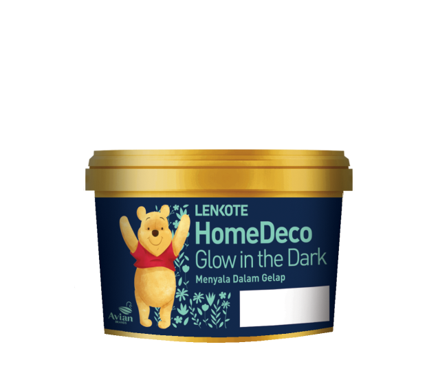 Untuk menambahkan kesan berbeda pada kamar anak, kamu bisa mengaplikasikan pola / karakter yang disukai si kecil bersama cat spesial efek HomeDeco Glow in the Dark yang dapat menghasilkan efek glow in the dark atau menyala dalam gelap, sehingga siluet karakter yang diaplikasikan dapat menyala saat lampu kamar dipadamkan.