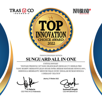 Avian Brands menerima penghargaan Top Innovation Choice Award 2022 untuk inovasi produk cat Sunguard All-In-One yang dilengkapi dengan UV Shield Pro. Penghargaan yang diselenggarakan oleh INFOBRAND.ID dan TRAS N CO Indonesia sejak 2019 ini diberikan kepada brand yang berhasil menciptakan inovasi berupa layanan atau produk.